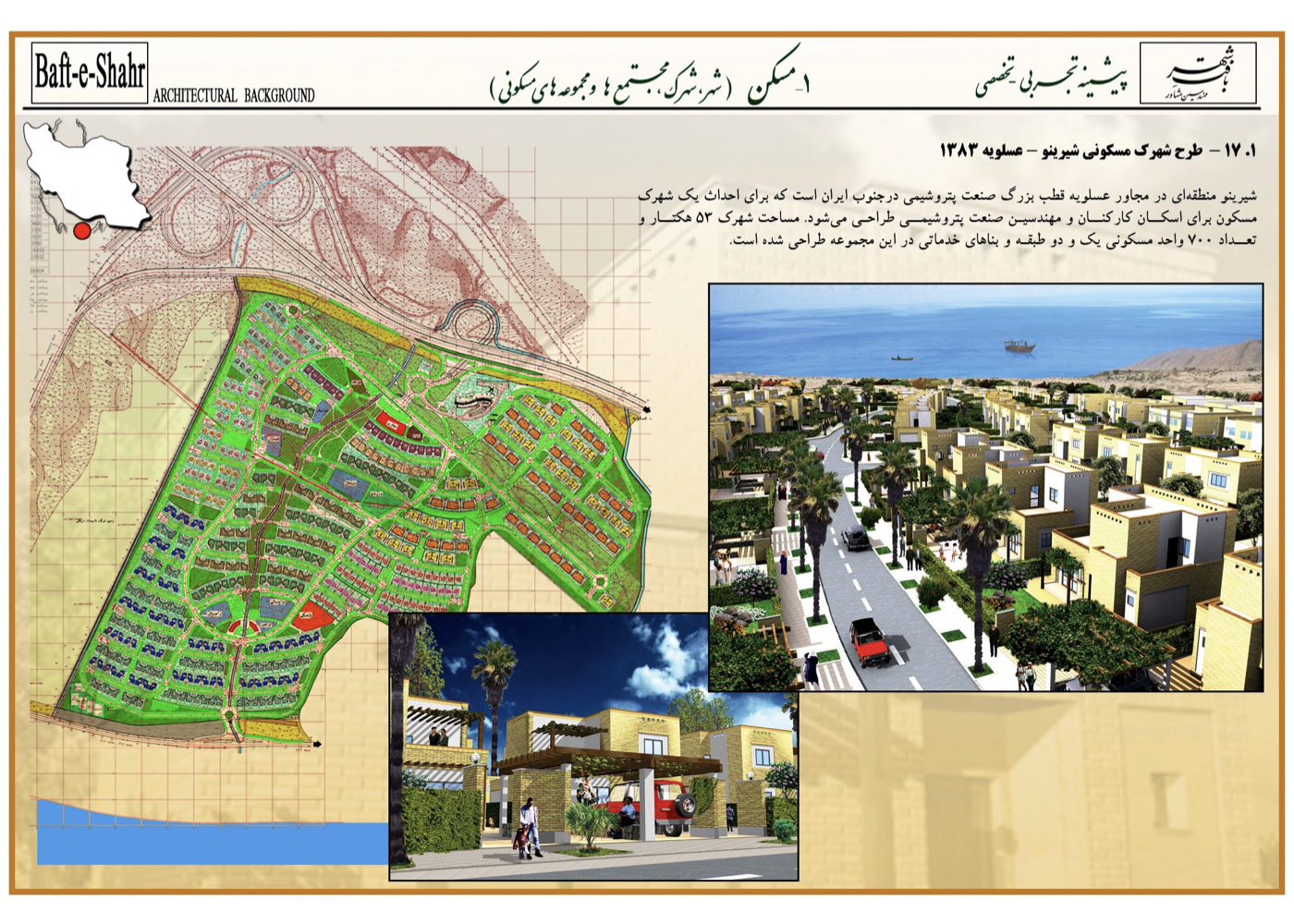 شيرينو منطقه اى در مجاور عسلويه قطب بزرگ صنعت پتروشيمى در جنوب ايران است كه براى احداث يك شهرك مسكونی براى اسكان كاركنان و مهندسين صنعت پتروشيمى طراحى واجرا شده است . مساحت شهرک ٥٣ هكتار و تعداد ٧٠٠ واحد مسكونى يك و دو طبقه و بناهاى خدماتى در اين مجموعه طراحى شده است. یاد آوری : این طرح بنا به سیاستهای کار فرما چند بار تغییر نمود . ابتدا برای اسکان کارشناسان پتروشیمی و پس از اجرای اسکلت ، درخواست شد به سکونت موقت کارگران سازنده کارخانه و سپس با تغییرات لازم مجددا برای سکونت کارشناسان . مدیریت طرح با اقای مهندس ابولقاسم کاوه بوده و من به عنوان مشاور فنی همکاری نمودم .