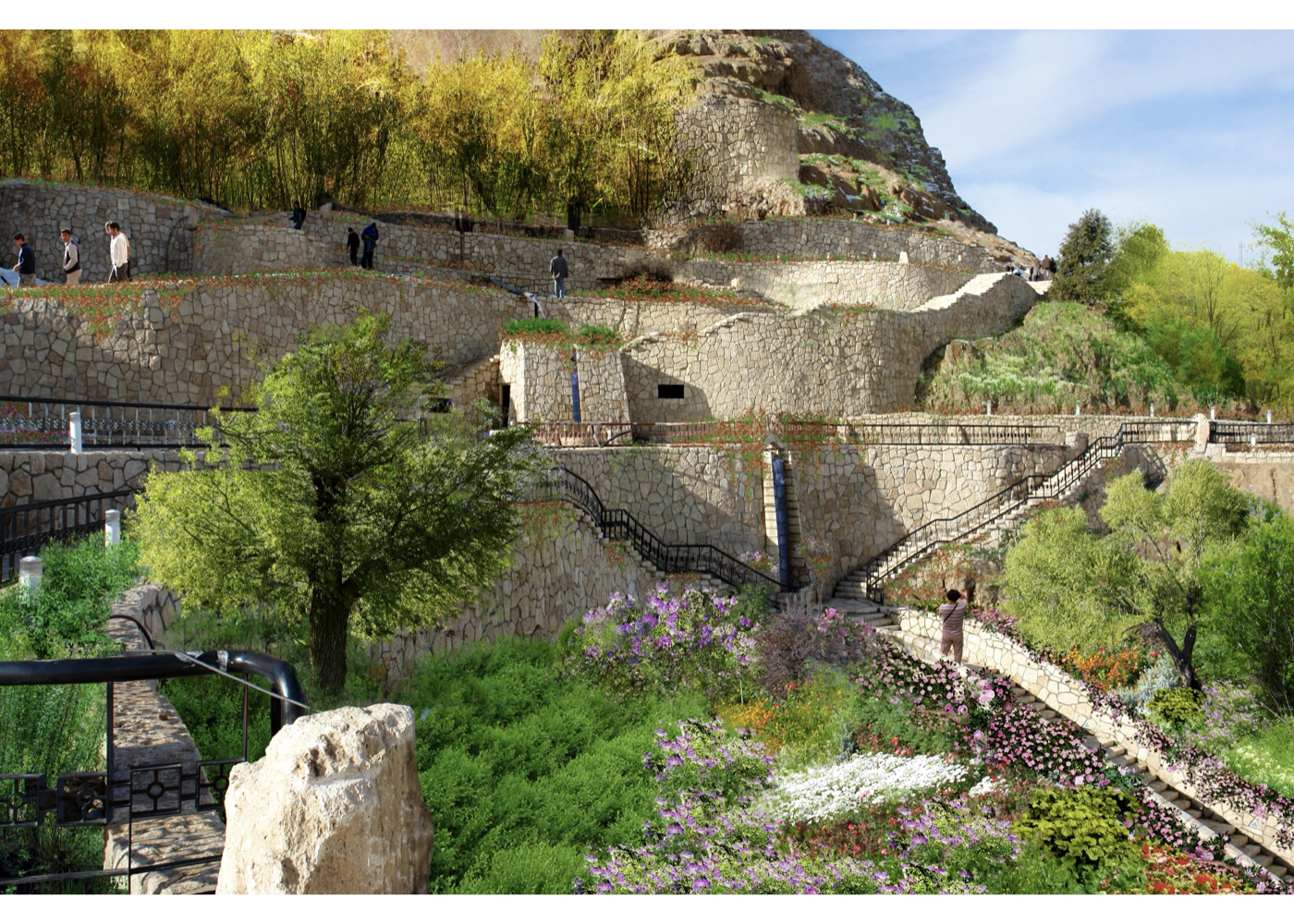 This project involves a historical tourism complex located along the slopes of Sofeh Mountain, with some elements dating back to the Safavid era. The design includes the pedestrian connection from the city to this site, terraced platforms for public gatherings, the revitalization of the natural value of springs and a pedestrian stream pathway beginning from the Pā-Chenār spring through the Sofeh lands. This route continues along the adjacent street and extends to the edge of the Zayandeh-Rood River, effectively linking the natural landscape of Sofeh Mountain to the river.
